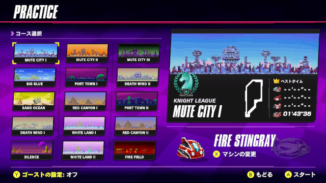 [ 2024年1月20日 ] 今日は・・・ですねぇ・・・ Nintendo Switch Online・・・つまりSwitchのゲームをオンラインプレイできる権・・・ を購入している人なら誰でもプレイできる これ ![]() をプレイした雑感みたいなものをまとめていこうかと思いますが、 私はいわゆるプロゲーマーみたいな存在ではなく、 そもそもゲームなんてやってる暇ネーヨ みたいな存在でして、 その上 レースゲームのような・・・コース覚えゲーみたいなのは本来苦手なので、 実力としてはプレイヤーが100人居たらせいぜい良くて30番とか、 そういう視点からお話させていただく事になりますので、 もっとガチでガチガチな攻略はココには存在しないとご理解下さい。 ただまぁ、一応 元祖F-ZEROは一時期ソフトを借りてプレイしていた過去はあります。 そういう意味では説明書が無くてもイケるイケる!って具合のアドバンテージ・・・つまり・・・強み? は、あるかなぁ・・・。 ※以下、極めて特別な理由が無い限り、私は機体名を省略して表記します。 BLUE FALCON:ブルーファルコンを「 青 」 GOLDEN FOX:ゴールデンフォックスを「 黄 」 WILD GOOSE:ワイルドグースを「 緑 」 FIRE STINGRAY:ファイアースティングレイを「 ピンク 」 操作方法や仕様みたいなのはゲーム内のTipsで確認可能ですが、 ![]() こういうレースゲームである以上 説明不要なものまで含まれてるので、 本当に必要そうな情報とかを私からいくつか厳選させて貰いますよ。 ![]() ヘアピン・・・つまり180度カーブとかの厳しいカーブを曲がるには ほぼ必須のテクニック。 基本的には、左に曲がるならアクセル離してL+左、 曲がりきったと思ったらすぐアクセル開始。 右のヘアピンカーブならR+右ですね。 ただ、マシンの種類によって曲がり方は多少変化しますが・・・それはまた後述。 マシン紹介の時にでも。 ![]() 書かれている通りなんですが、 実はマシンによってそのロケットスタート成功の受付タイミングはかなり違います。 これをこの場で文章で説明するのはなかなか難しいんですが・・・ こう・・・シグナル表示タイミングを横軸の図にすると・・・ ●・・・●・・・●・・・● 青 ┣━━┫ 黄 ┣┫ 緑 ┣━━━┫ ピンク ┣━━━━━━━━┫ 加速力の高い機体ほど受付時間がシビアになります。 これ以前からアクセル開始すると一時的に更に超加速できますが、すぐ失速します。 ![]() 原作をプレイしたことがある人ならば 恐らく体が覚えている説明不要のテクニック。 基本的にはジャンプ台へは下を押しながら進入。 例外なのは大ジャンプでかっとばしちゃうと、 加速床や、連続ジャンプ台の中の 乗りたい本命ジャンプ台を飛び越えてしまうような時。 ![]() 原作をプレイしたことがある人ならば 恐らく体が覚えている説明不要のテクニック2。 こちらは例外無く 着地の際は必ず下押し。押していないとスピードダウンしちゃってペケ ![]() 加速力:2位 最高速:3位 グリップ力:3位 装甲:3位 無傷の状態から4回ターボが使えて、回復エリアではおよそ1.5ターボ分くらい回復する。 つまり余計なダメージを受けなければ8回のターボが可能。 弱いわけではないけど器用貧乏の悪いところが目立つ感じ。 一人で気持ちよく走れるなら善戦できるけど、 他人と接触するとぶっとばされて、あとは揉まれて沈む感じ。 黄色ほどじゃないけど気持ち多めにターボできるあたりを強みに立ち回ると良い。 ![]() 加速力:1位 最高速:4位 グリップ力:4位 装甲:4位 無傷の状態から4回ターボが使えて、回復エリアではおよそ3ターボ分くらい回復する。 つまり余計なダメージを受けなければ13回のターボが可能。 1周につき3ターボ分のエネルギーが回復するという事は、 他よりも2回余分にターボしても良いという事。 ターボを使うべき場所を2箇所設定しておき、 残りの1回は不意の接触等からの復帰用とかにすると戦績が安定する。 グリップ力が非常に弱いので、どうでもいいような緩いカーブでも 瞬間的にアクセルを切らないと曲がれないような、 なんというか戦法的に消極的なプレイになるけど、実際それが一番速い。 氷ステージのヘアピンカーブなどは、 そのあまりのグリップ力の無さからアクセル離しくらいでは曲がり切れず、 L・Rドリフト+アクセルボタン連打で小刻みにグリップ回復させた方が曲がれる。 実は青も同じような状況になるが、向こうはギリ行けなくもない感じなのに対し、 黄色だと100%ムリ状態。 ![]() 加速力:3位 最高速:2位 グリップ力:2位 装甲:1位 無傷の状態から5回ターボが使えて、回復エリアではおよそ1ターボ分くらい回復する。 つまり余計なダメージを受けなければ8回のターボが可能。 単純な走力の面で考えると青のように器用貧乏感があるけど・・・ 緑の最大の利点は他者との体当たりに非常に強いところ。 黄色や青が弾かれて壁に激突していく中、緑は悠然と自分の設定したコースを走り続けられる。 あと、性能グラフで見るとグリップ力2位ではあるけど、 実感としては3